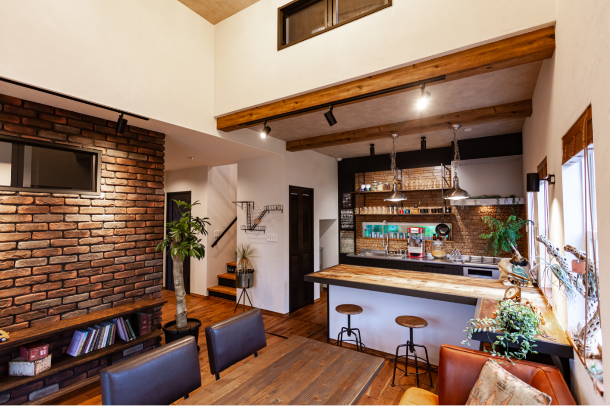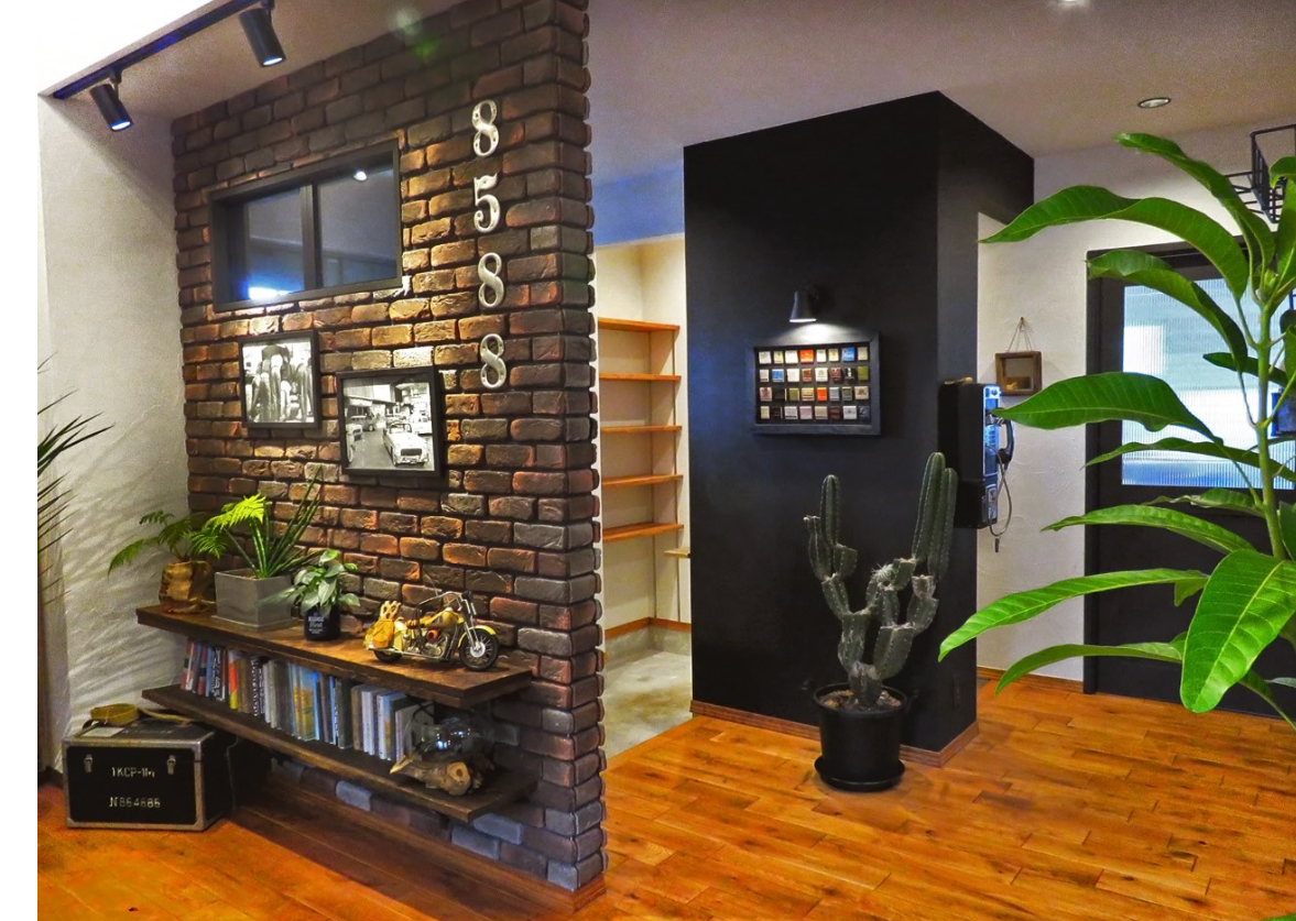 モデルハウス ラップサイディングとブリックタイルの外観。柱には造形モルタルで石積み風仕上げ。1Fはアメリカンビンテージ・ブルックリンスタイル。2Fはインダストリアルスタイルでコーディネート。1階はオークの無垢材・2階は浮造りのビンテージ加工を施した無垢材。1階の高い天井にはスチールで作ったメッシュの床はスケルトンに。 全館空調の快適な空調など、実際にご来場して体感して下さい。 ギャラリー 玄関&リビング 天井を高くして開放的なLDK インダストリアルテイストの2F