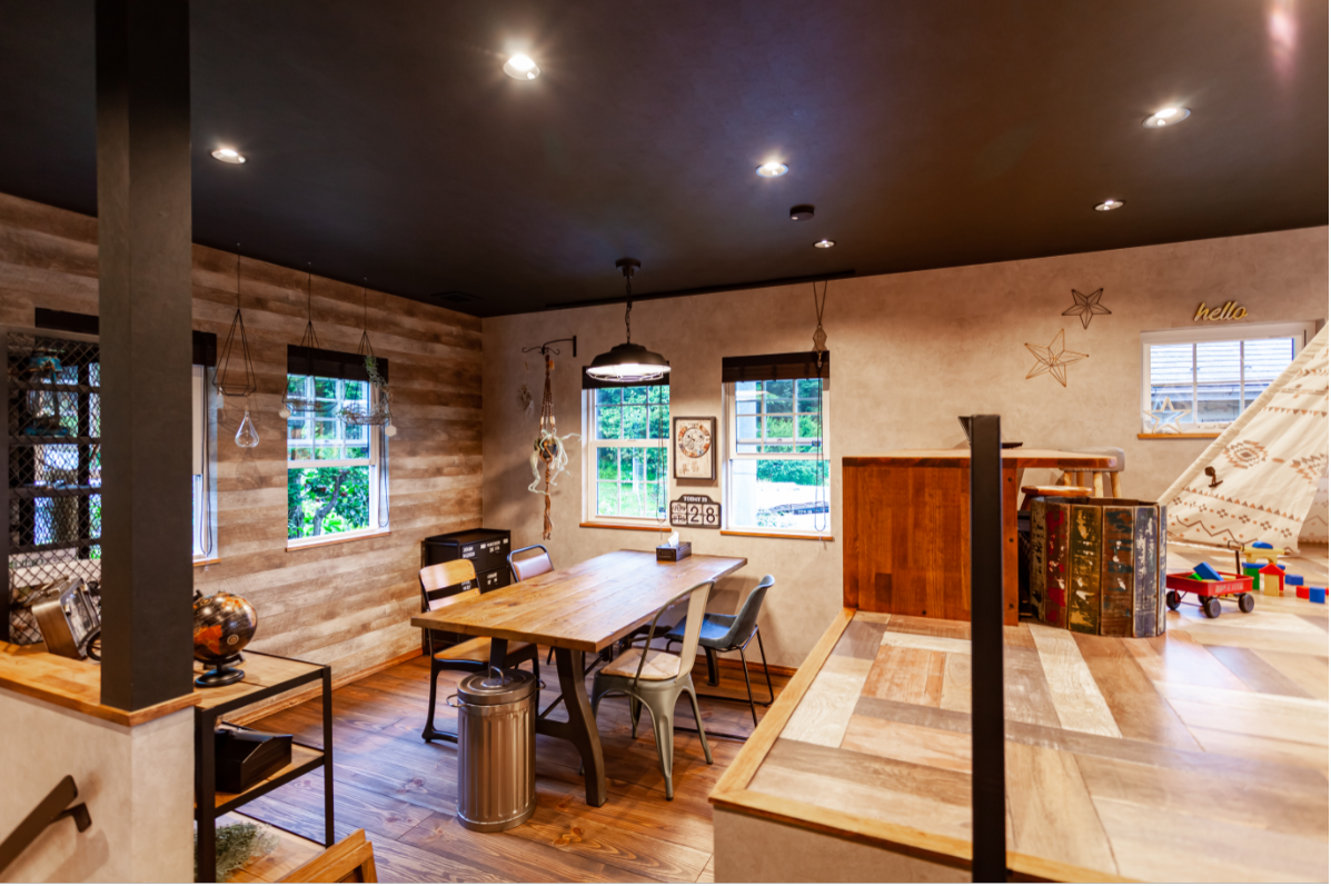 施工実例 モデルハウス ラップサイディングとブリックタイルの外観。柱には造形モルタルで石積み風仕上げ。1Fはアメリカンビンテージ・ブルックリンスタイル。2Fはインダストリアルスタイルでコーディネート。1階はオークの無垢材・2階は浮造りのビンテージ加工を施した無垢材。1階の高い天井にはスチールで作ったメッシュの床はスケルトンに。 全館空調の快適な空調など、実際にご来場して体感して下さい。 ギャラリー 玄関&リビング 天井を高くして開放的なLDK インダストリアルテイストの2F 施工実例に戻る