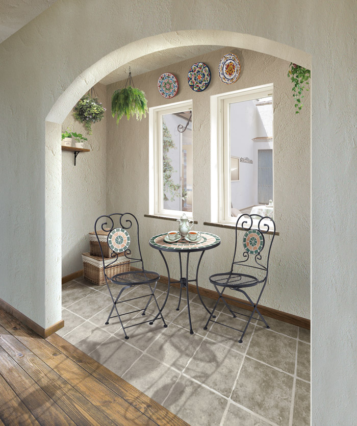 玄関、キッチンからも繋がる青空の下のリビング「パティオ」。 いつも暮らしの中心にパティオがある。太陽が顔をのぞかせ、 雨が潤すこの場所は素焼きの鉢に小さな苔が生えてきたり 、アイアンのイスに少しずつ青錆が付いていく。でも、そんな様子が愛おしい。 10年後、さらに角が丸く、優しい表情になっていく。 このパティオに居る時間が、家族を育ててくれる。